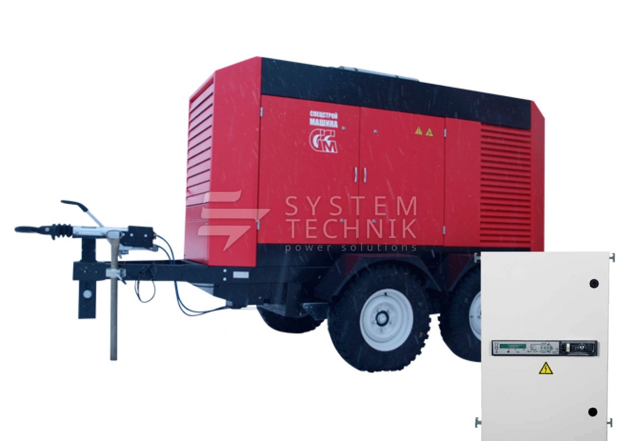 - ССМ ЭД-100-Т400-2РПМ1 в погодозащитном кожухе на шасси с АВР на прицепе
